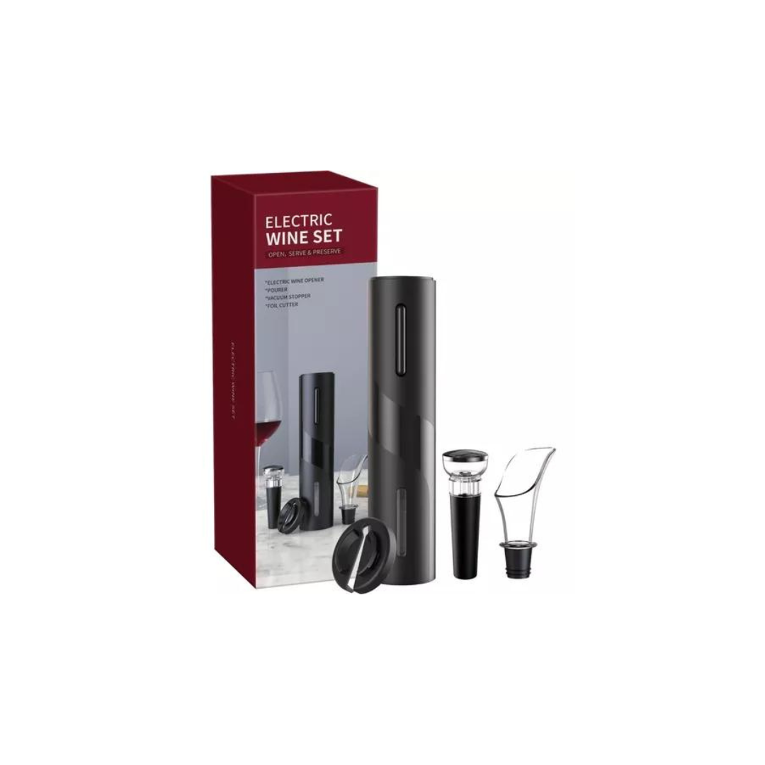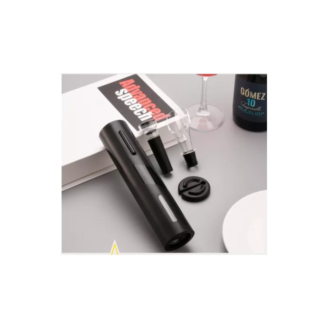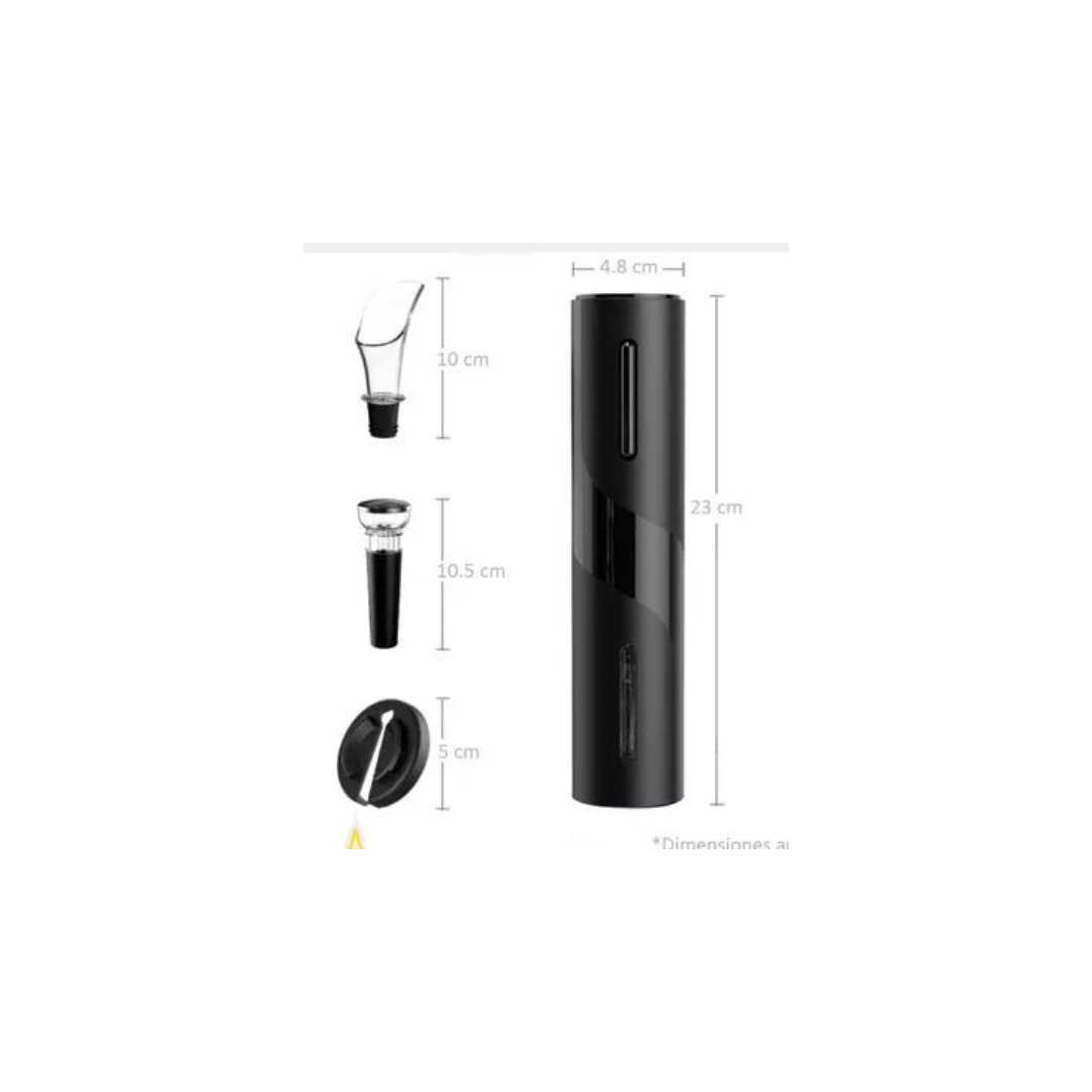 Kit 4 en 1 con Descorchador Eléctrico + Boquilla Vertedora + Tapón de Vacío + Cortador RedondoEl regalo perfecto para los amantes del vino, abre de manera elegante y rápida las botellas de vinoCARACTERÍSTICAS:- Abre tu vino sin esfuerzo- Diseño ergonómico y con doble botón pulsador (arriba y abajo)- Fácil de transportar, almacenar y usar- El descorchador funciona con corchos con diámetro de 20 a 24 mm y largo de 44 mm- El descorchador funciona con botellas de vino con un diámetro exterior de cuello de botella de no más de 35 mm y un diámetro interior de cuello de botella de 17,5 mm a 23 mm- La boquilla vertedora funciona con botellas de vino con un diámetro interior de cuello de botella de 18 mm a 19 mm- El tapón de vacío funciona con botellas de vino con un diámetro interior de cuello de botella de 17,5 mm a 20 mmMODO DE USO1. Utiliza el cortador redondo para remover el aluminio protector en el cuello de la botella2. Sostén la botella en un lugar plano y presiona la punta del sacacorchos sobre el corcho mientras presionas el botón inferior.3. Una vez que el corcho esta completamente atornillado, puedes removerlo levantando el sacacorchos.4. Oprimiendo el botón superior expulsas el corcho.